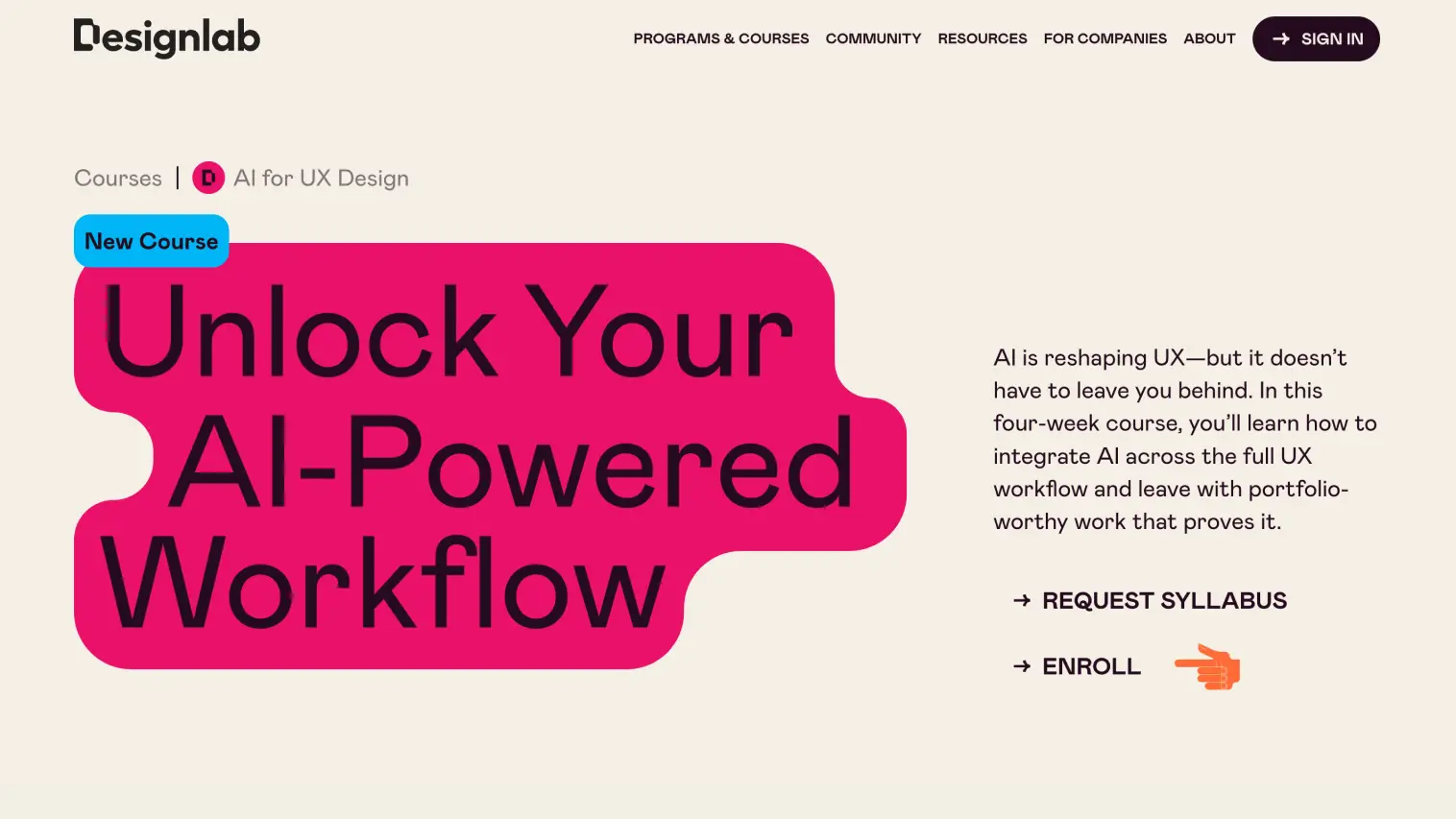 This course from Designlab is designed to help UX and product designers integrate AI into their workflows, enabling them to work faster, more creatively and strategically with AI-tools.