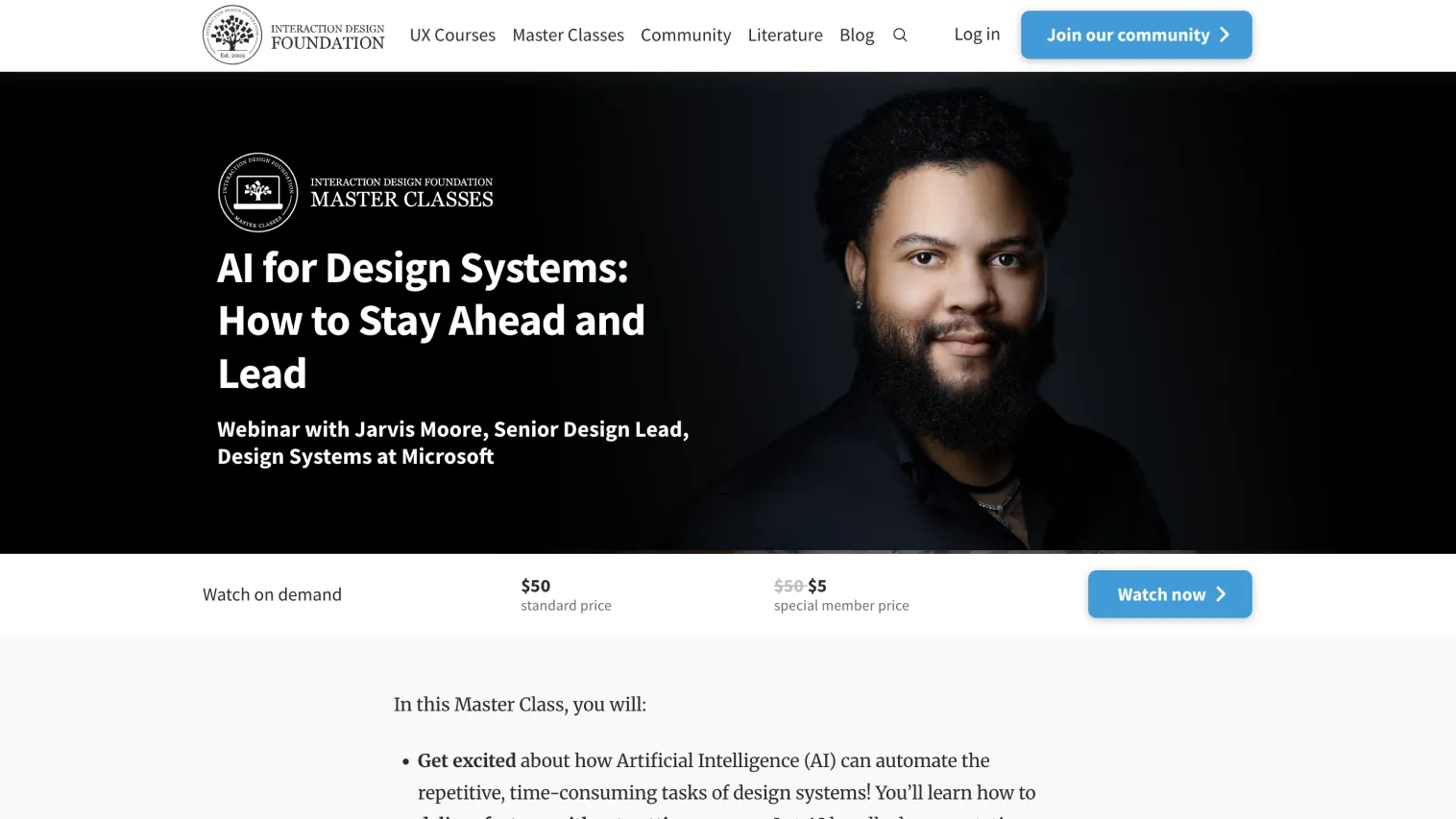 This Master Class from IxDF is designed to help design system leads and senior designers understand how to apply AI within design systems, elevate efficiency, and lead AI-enabled workflows.